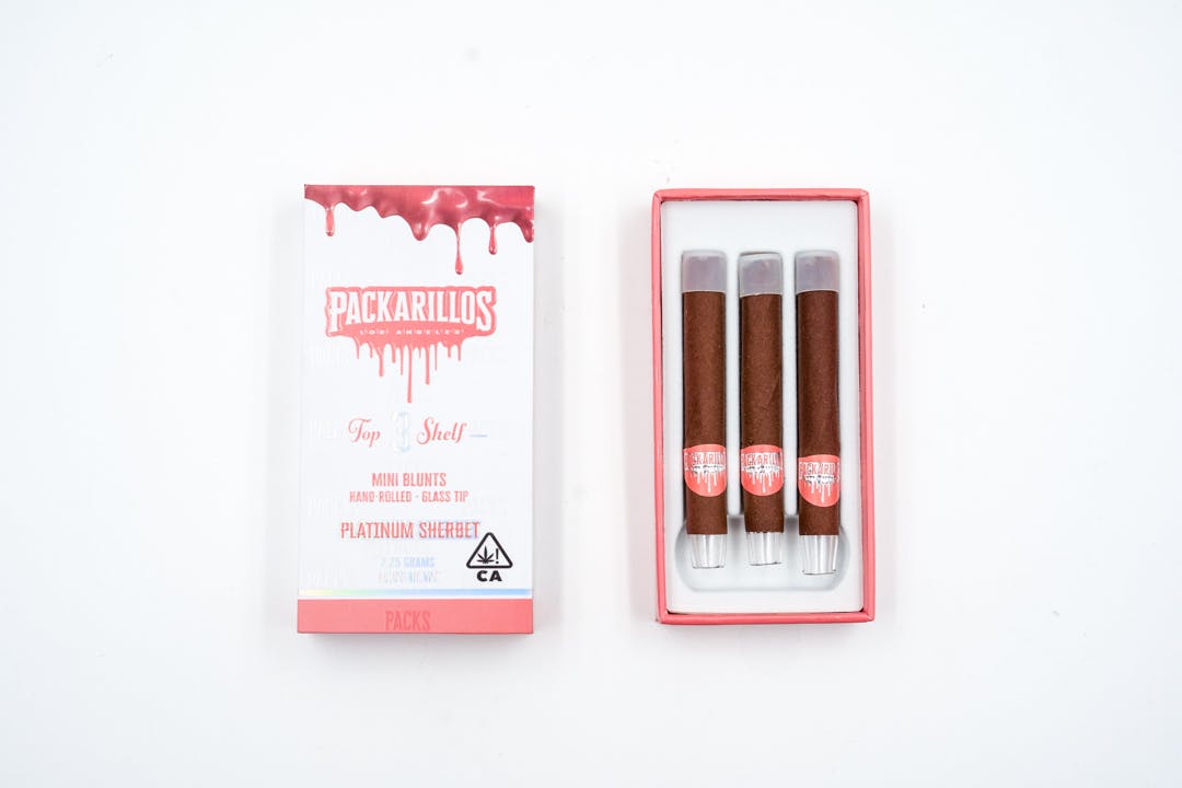 Packwoods Packarillos Platinum Sherbert are mini pre-rolled blunts containing premium cannabis flower, specifically the Platinum Sherbert strain, and are designed for convenient, portion-controlled consumption. They are part of Packwoods’ curated pre-roll collection and are known for their quality and portability.